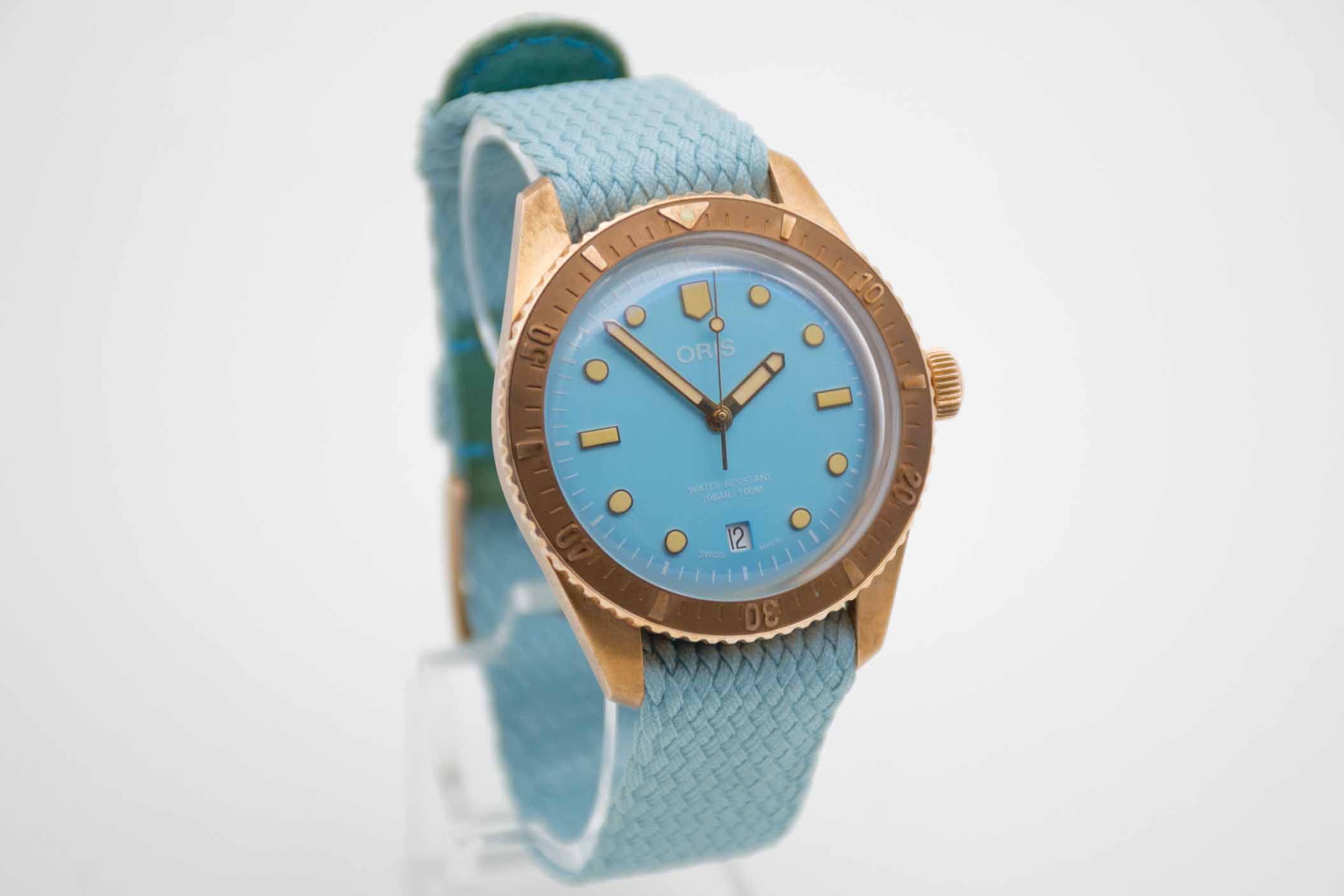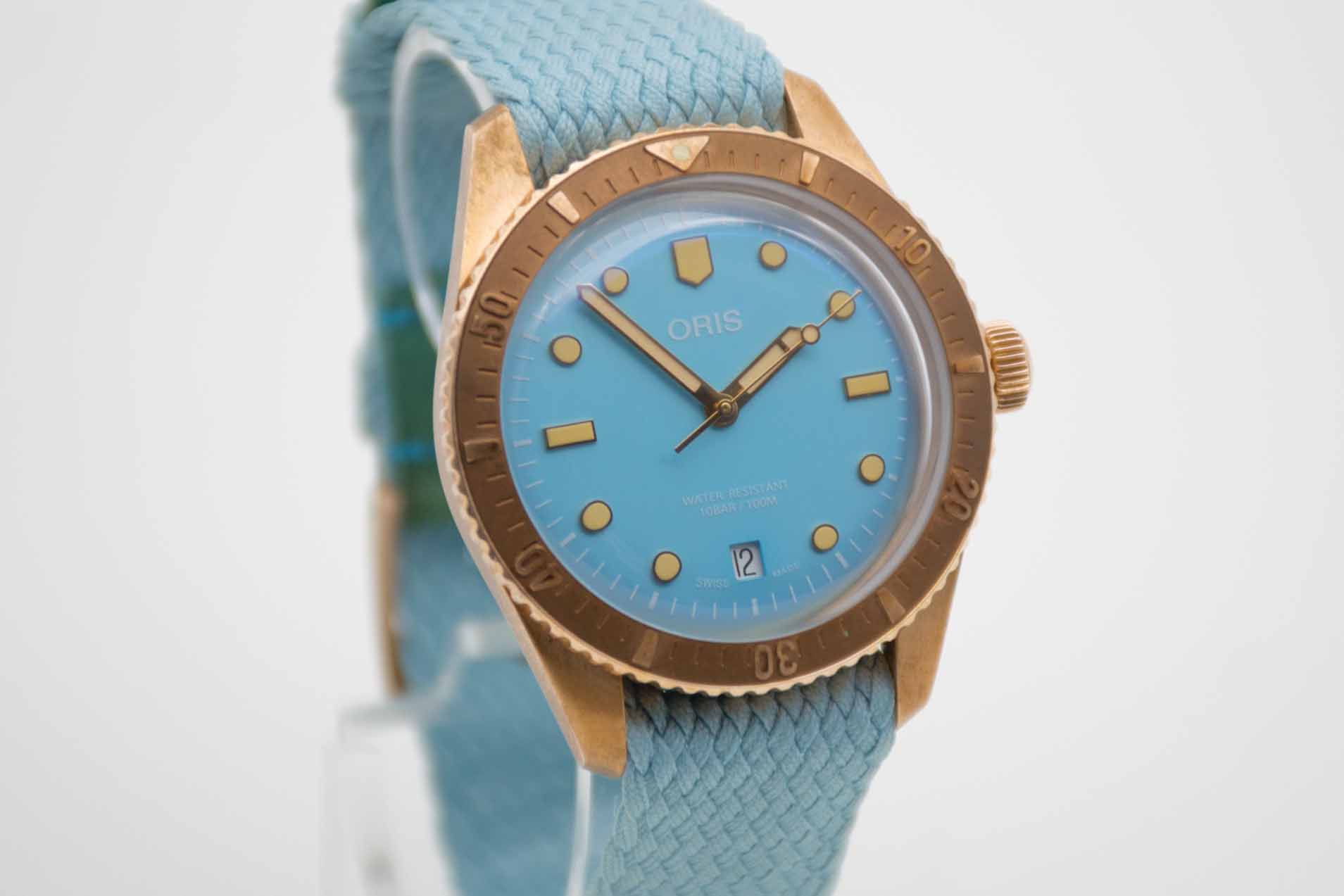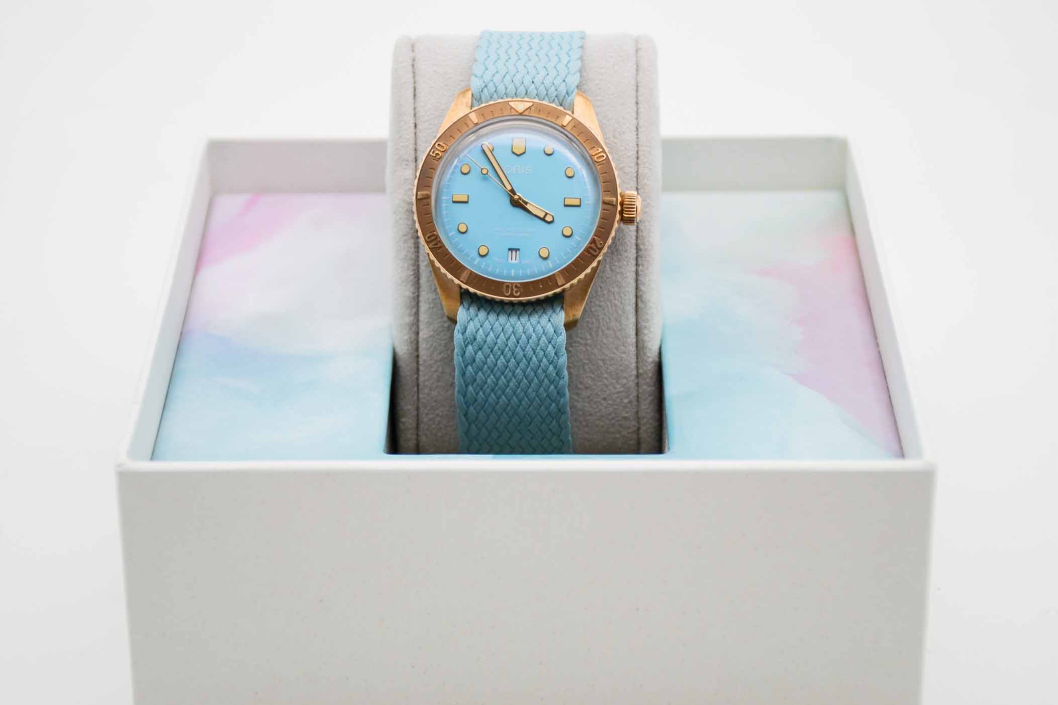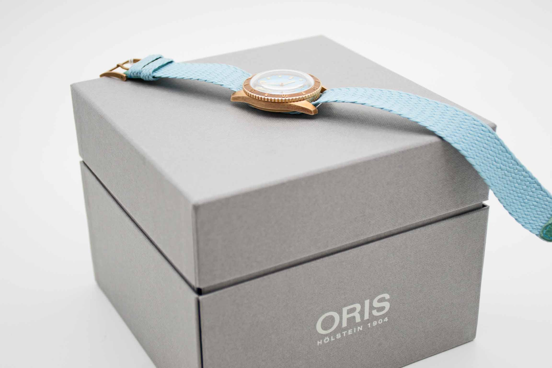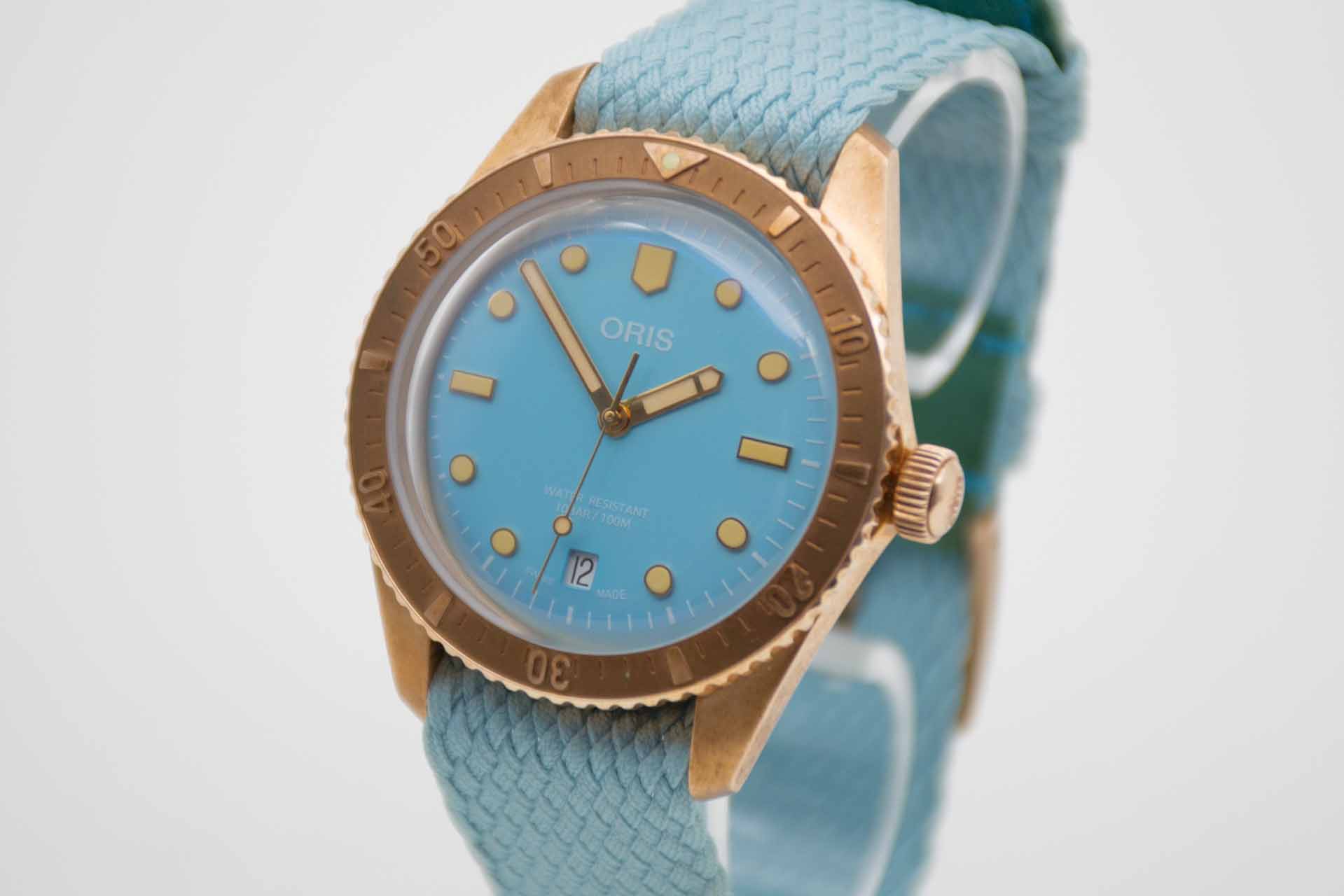 Divers Sixty Five Cotton Candy 733 7771 3155-07 3 19, 38 mm Bronze Gehäuse mit Tiffany grünem Zifferblatt und passendem Textilband mit Oris Dornschließe. Fullset in Oris Box mit Umkarton und Schuber, Bedienungsanleitung, Garantieverlängerung bis 2028, Preisschild und Garantiekarte aus 2025 (deutsche Auslieferung). Die Uhr befindet sich in perfektem und absolutem Neuzustand.