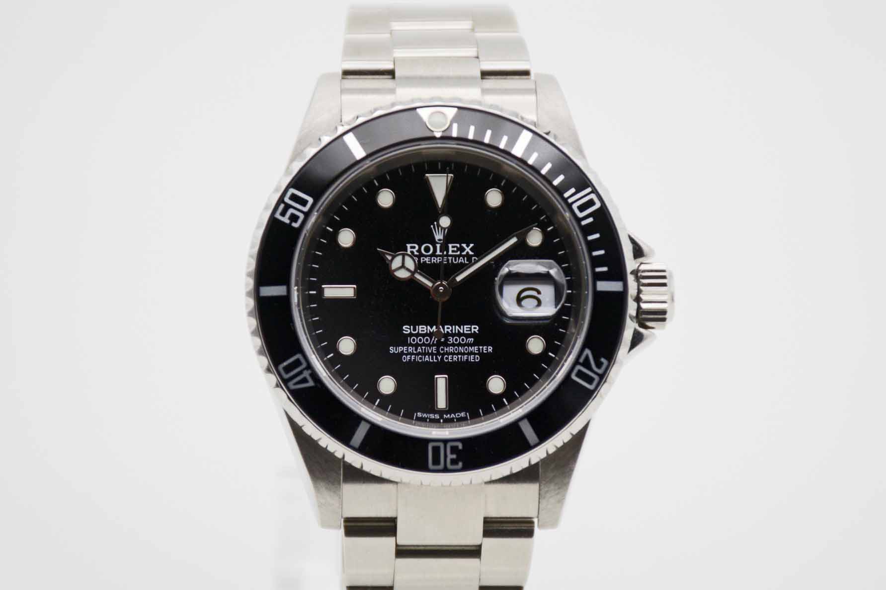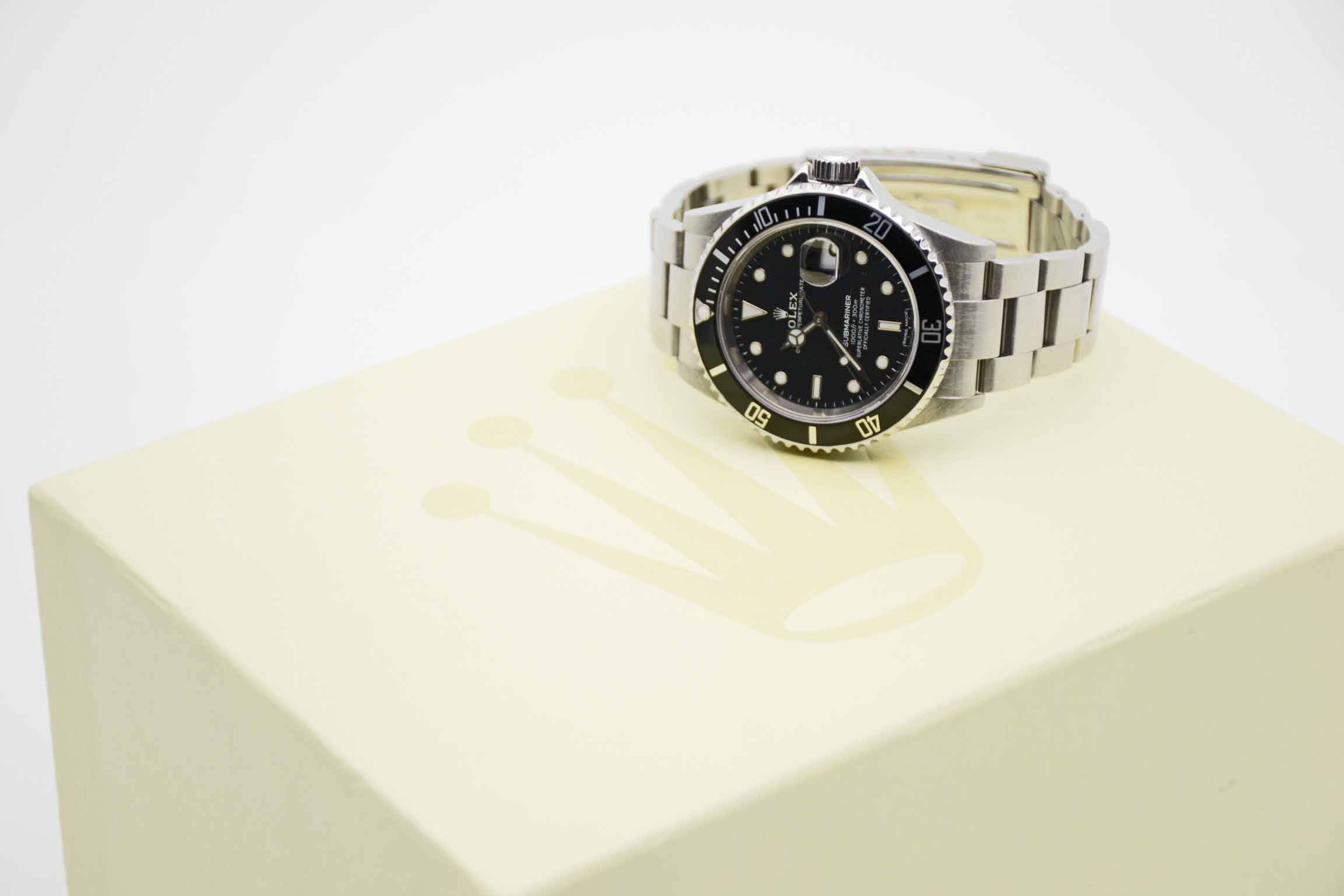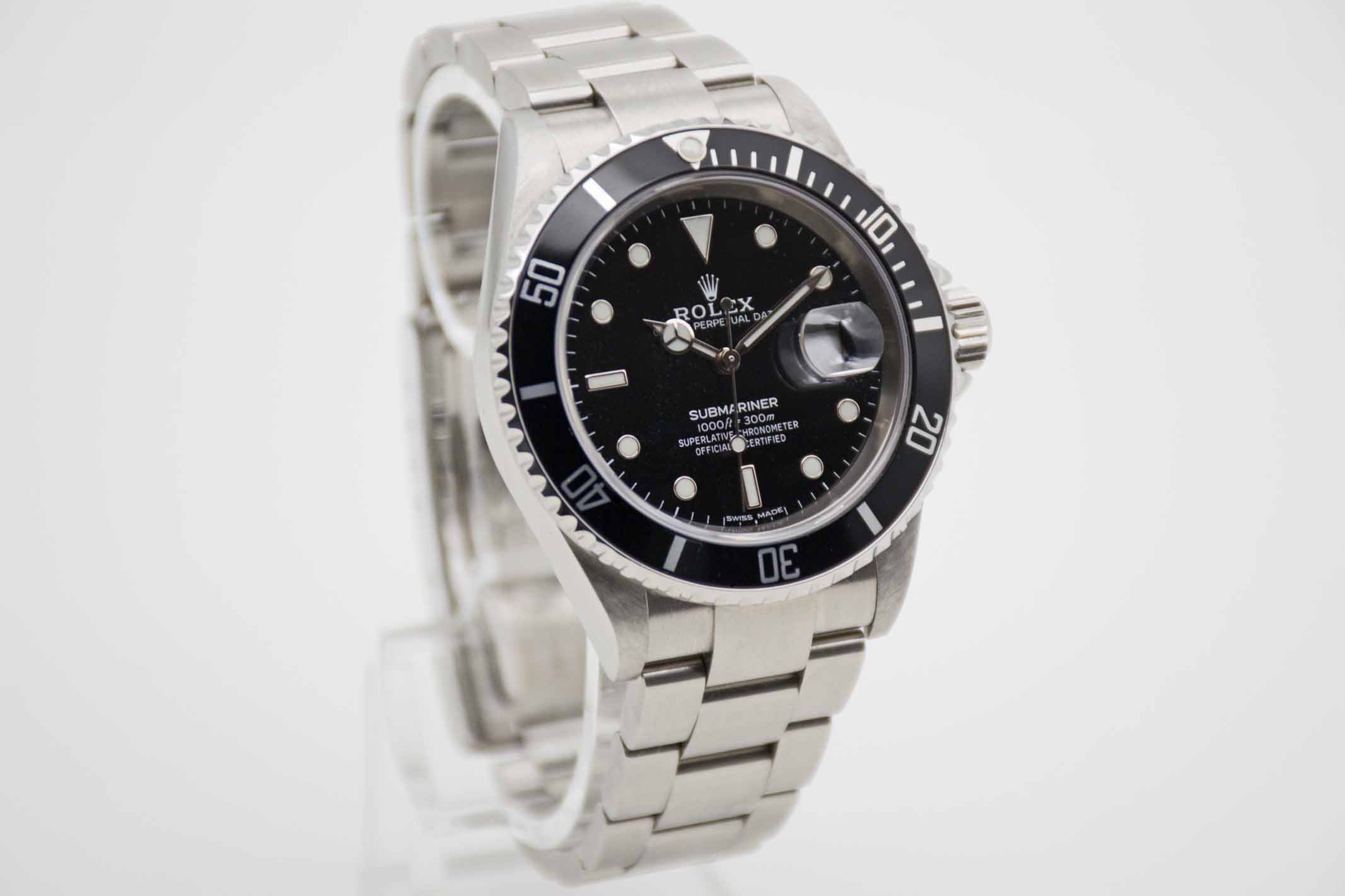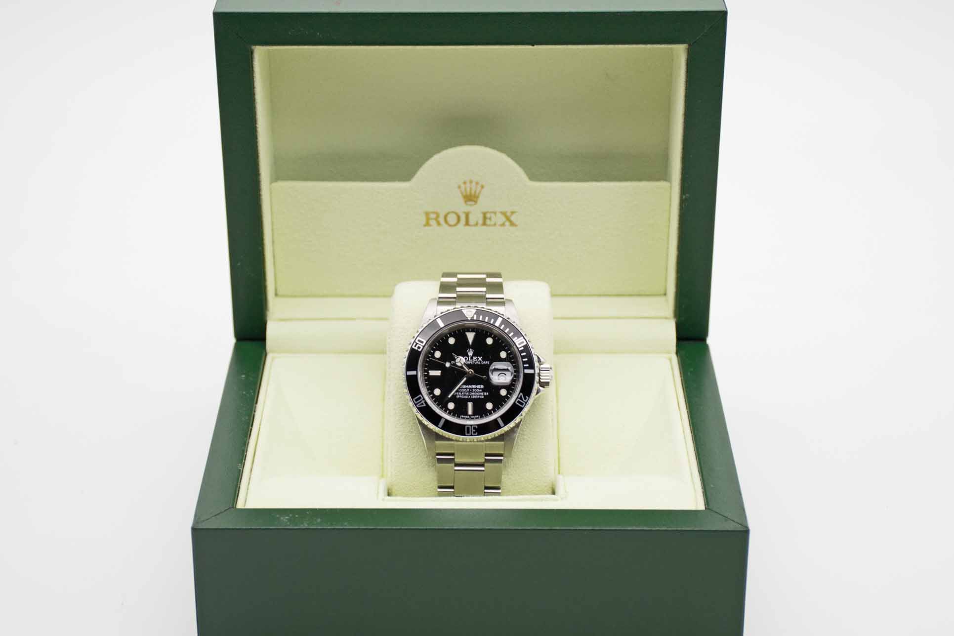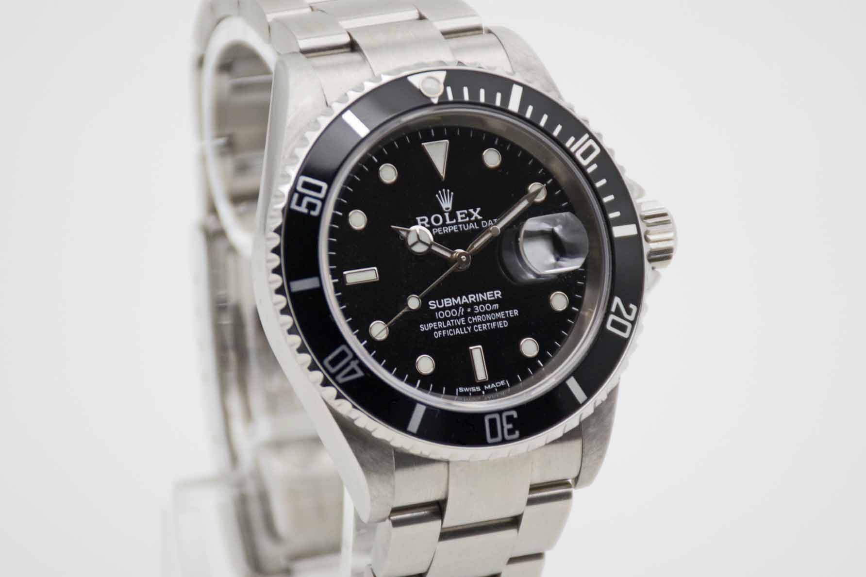 Submariner Date 16610T, 40 mm Gehäuse ohne Bohrungen mit schwarzem Zifferblatt und schwarzer Lünette sowie passendem Rolex SEL Oysterarmband mit passendem Schließencode (EO 2006/2007) ohne Spannungsverlust. Perfekter Neovintage Diver in Rolex Box mit Umkarton, Oyster Booklet, Chronometer Booklet, neuem Service und Rolex Garantiezertifikat aus 12/2006 (Z-Serie/EU). Die Uhr befindet sich in perfektem und sehr gepflegtem Zustand. Inzahlungnahmen sind möglich. Bitte sprechen Sie uns hierzu an.