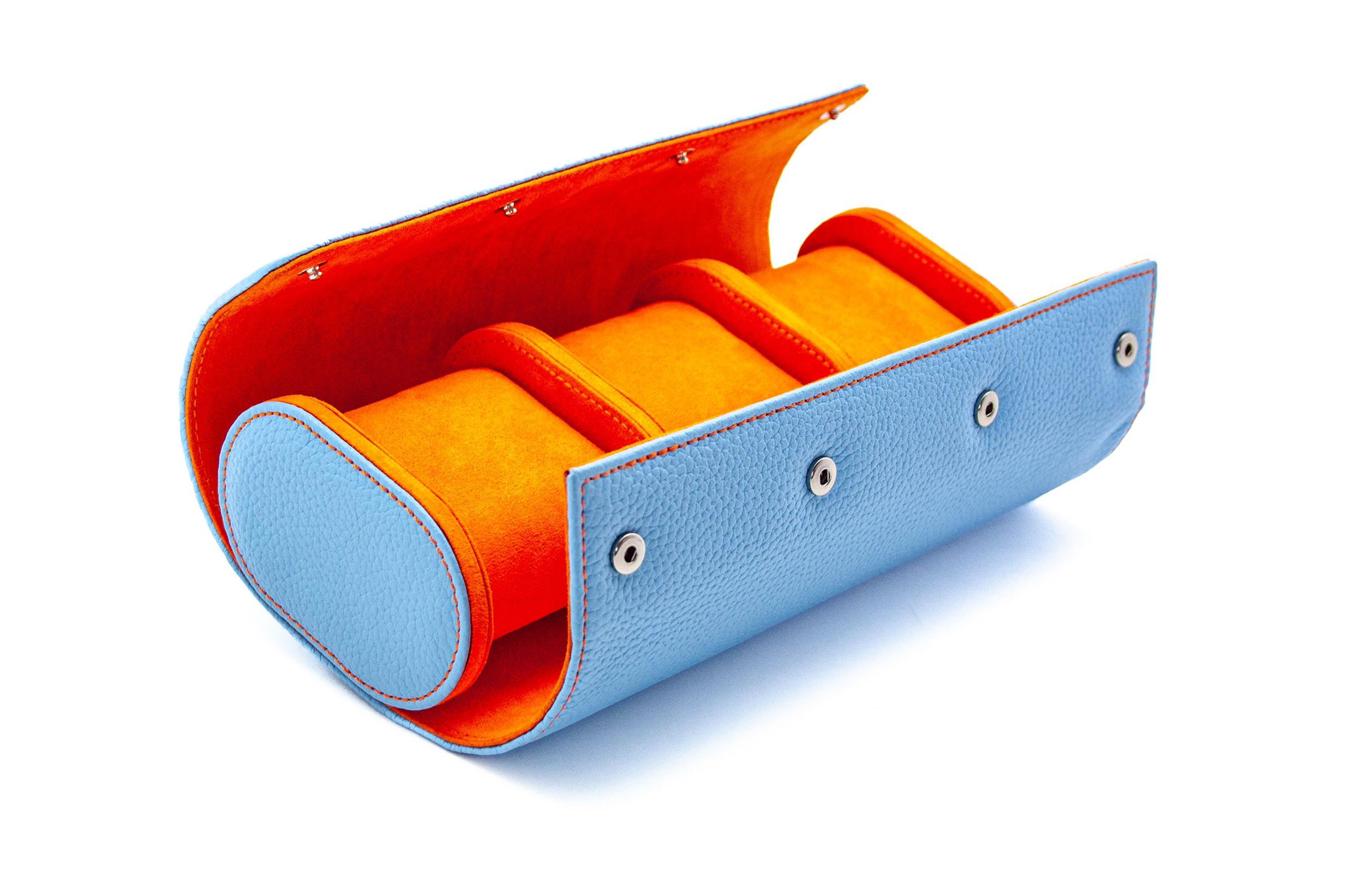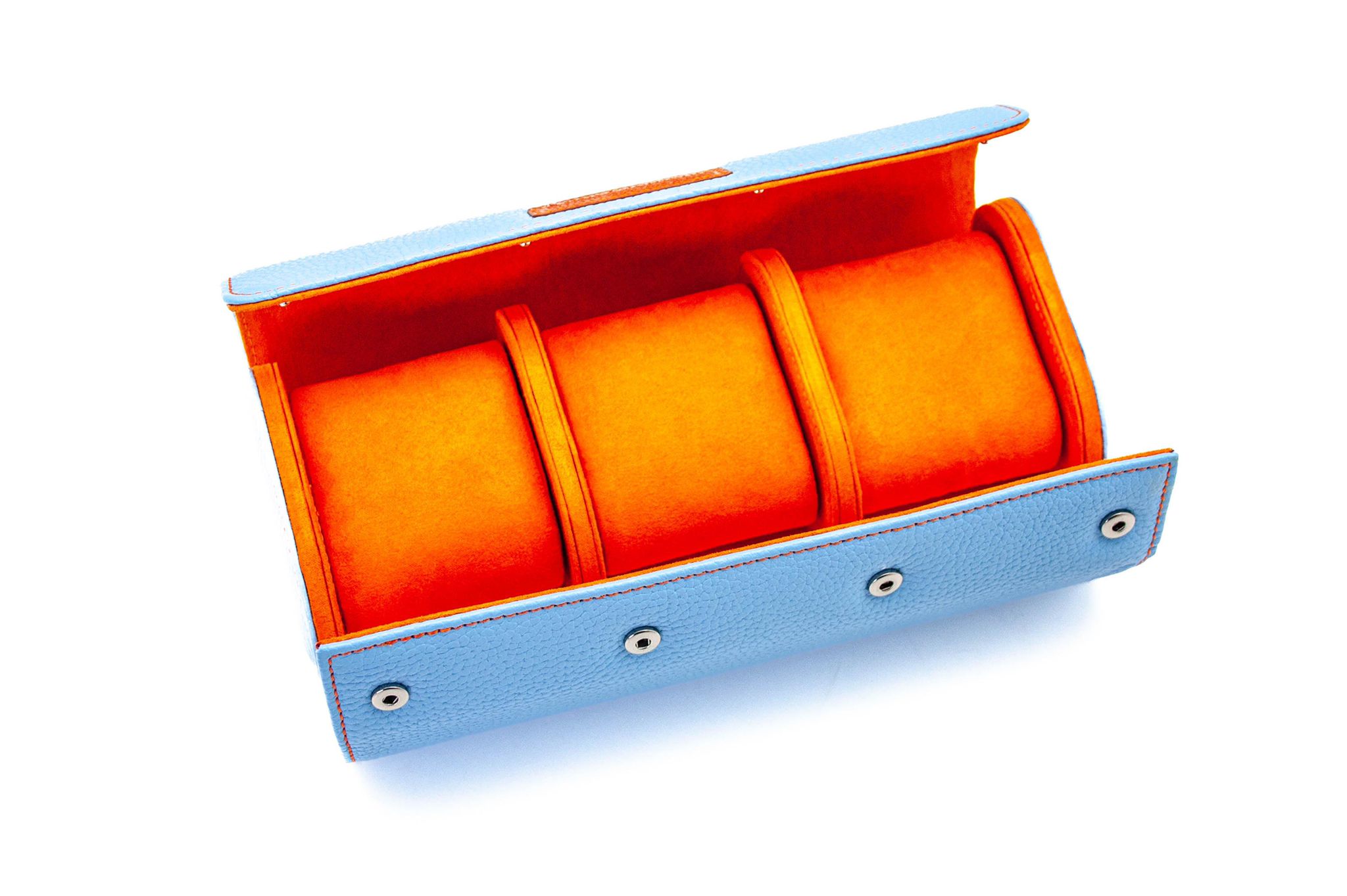 Der ultimative Schutz für Transport und Aufbewahrung von bis zu drei Luxus-Armbanduhren. Die ganz im Style des GULF Racing Teams der 70er Jahre gehaltene Uhrenrolle ist in Echtleder gefertigt und im Inneren mit Veloursleder ausgeschlagen. Passend für Armbanduhren bis 47 mm Durchmesser. Deckel sowie Einlegekissen werden durch hochwertiger Edelstahldruckknöpfe (keine Magnete) gesichert.