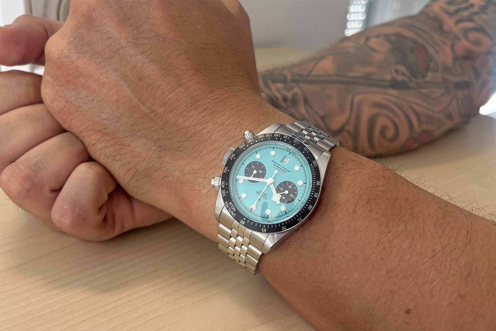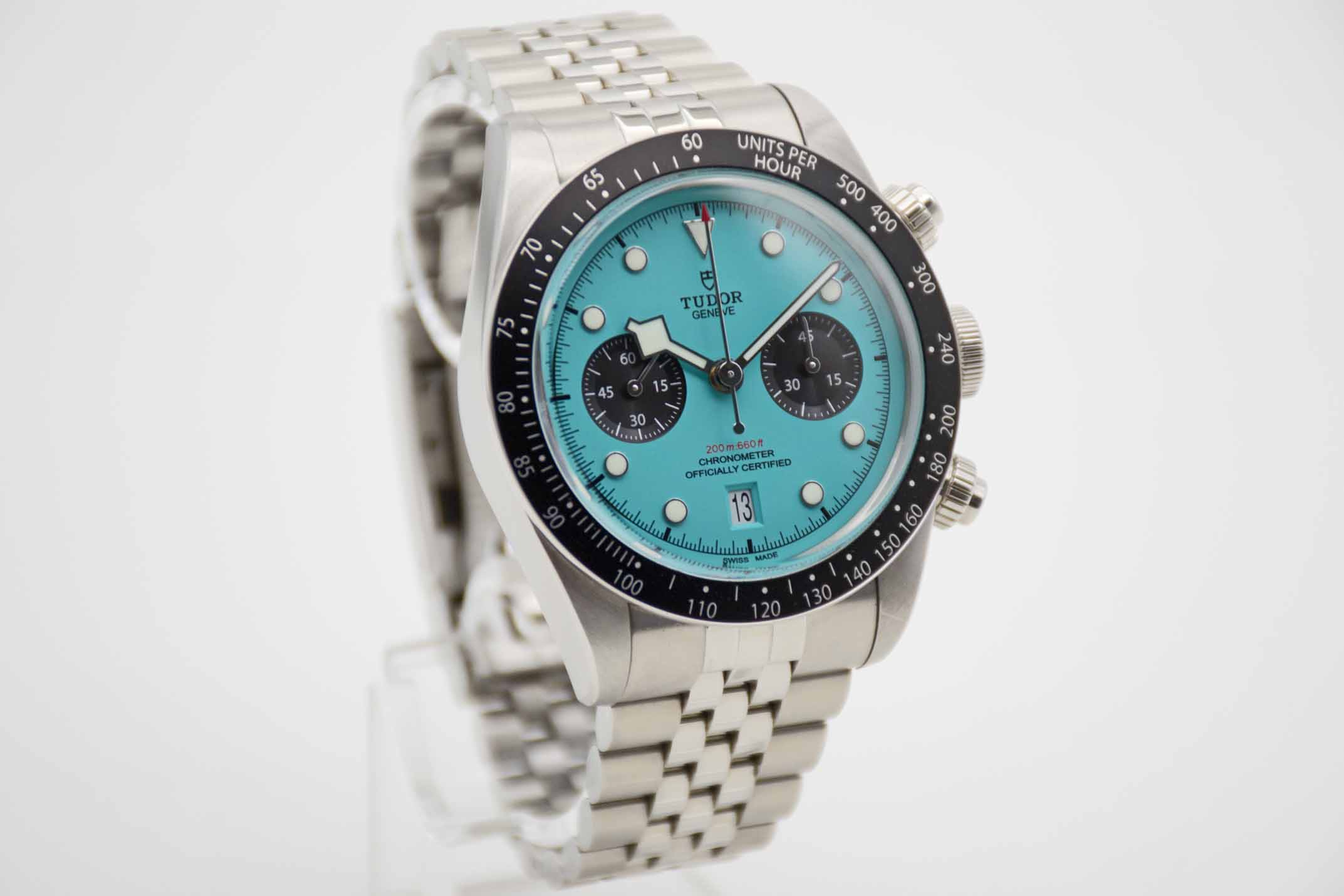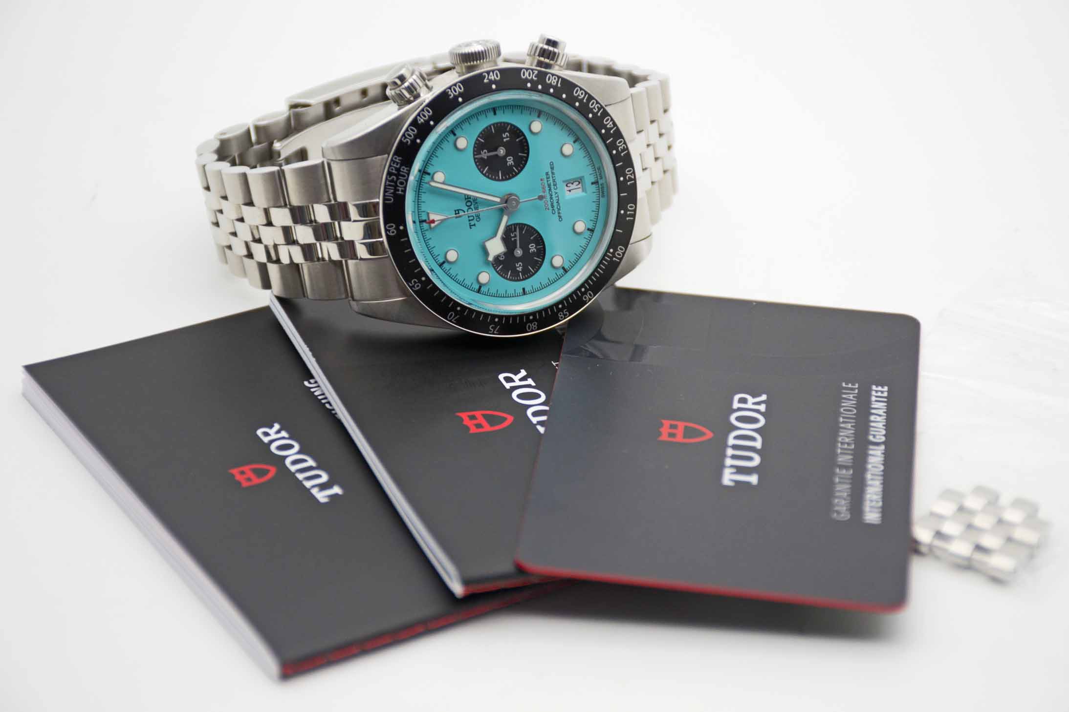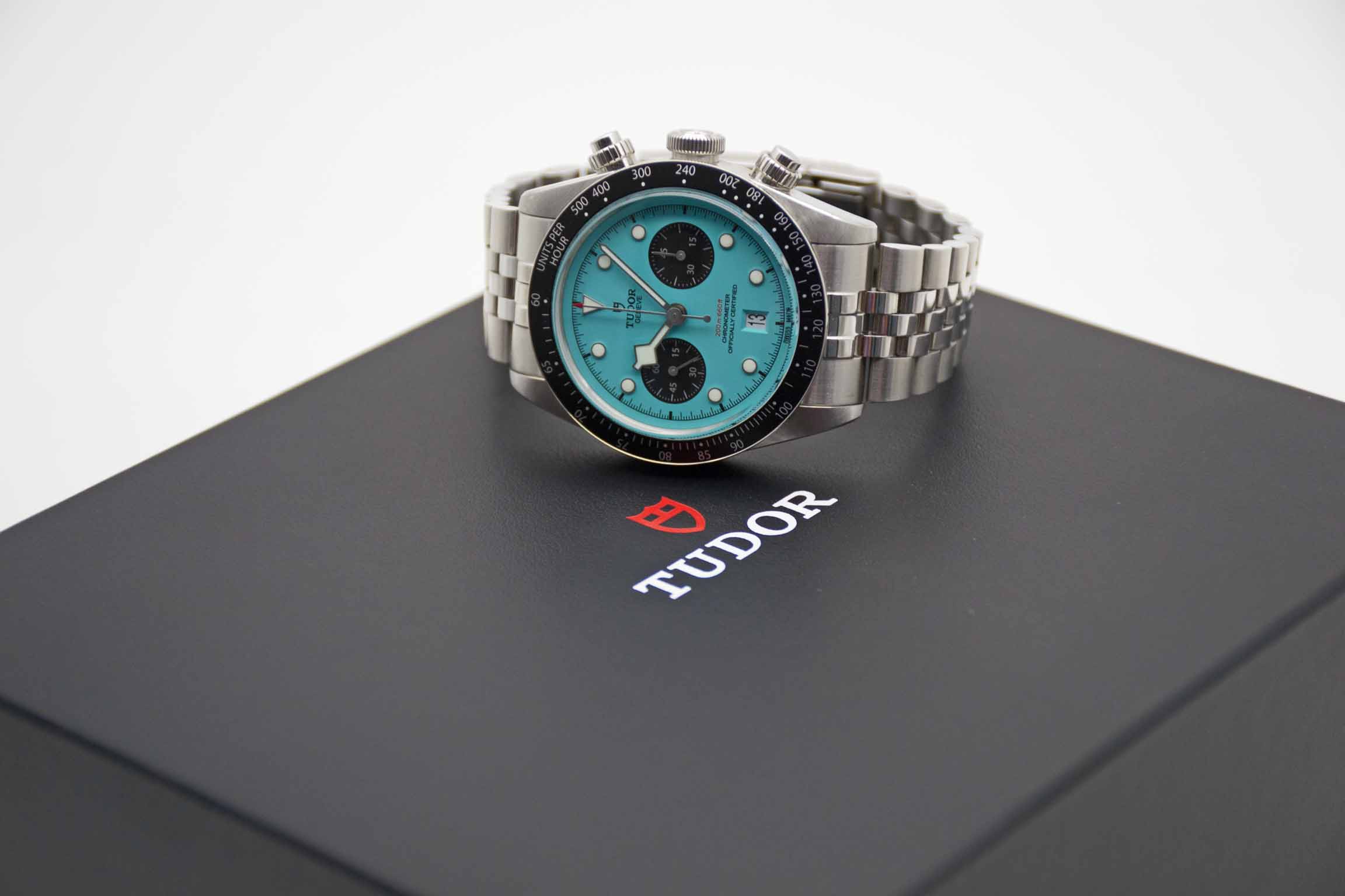 Black Bay Chrono Blue Flamingo 79360N-0024, 41 mm Gehäuse mit türkisem Miami Zifferblatt, Keramik Lünette und Tudor Jubilée Armband. Perfektes Fullset in Tudor Box mit Umkarton, deutscher Anleitung, Chronometer Booklet und Tudor Garantiekarte aus 2025 (LC100/Deutschland). Neuwertige Flamingo Black Bay im perfekten Zustand. Zu unserer Sicherheit lagern wir sämtliche Uhren unseres Bestandes extern im Banksafe, daher bitten wir um vorherige Terminvereinbarung.